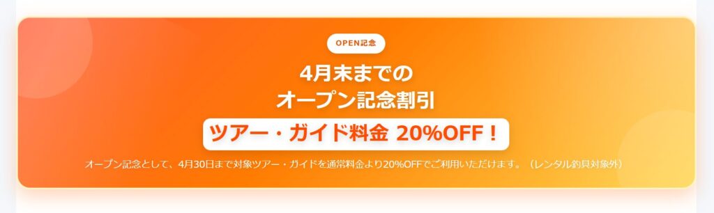 この度、オープン記念としてツアー・ガイド料金を期間限定で20%OFFとしました!!(レンタル釣具除く)
